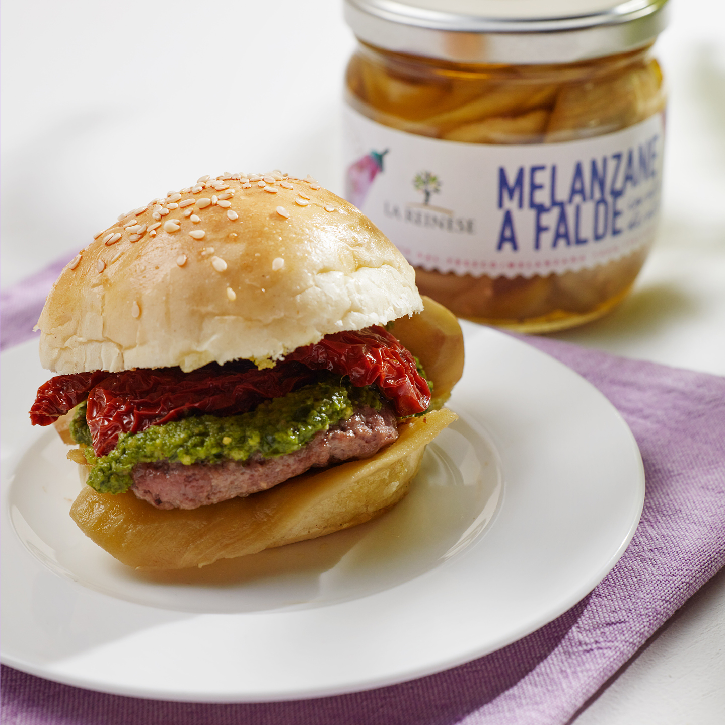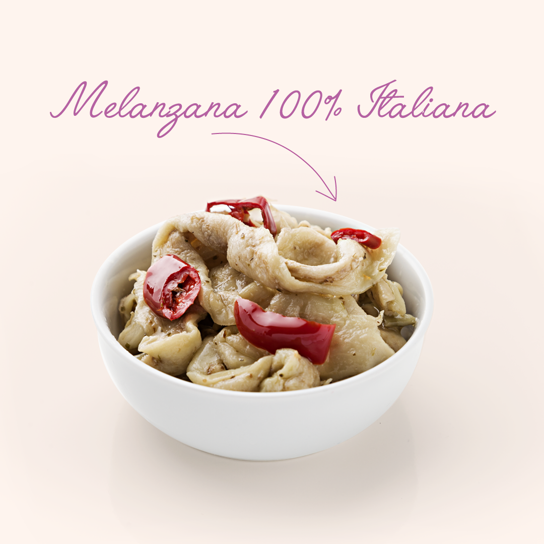 Ingredienti: Melanzane 60%, olio di semi di girasole 35%, olio extra vergine di oliva, sale, peperoncino piccante, aglio, origano, aceto di vino (contiene anidride solforosa), correttore di acidità: acido citrico; antiossidante: acido L-ascorbico. Può contenere tracce di pesce e sedano.